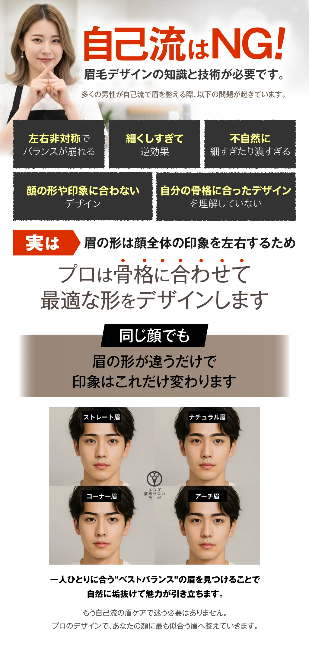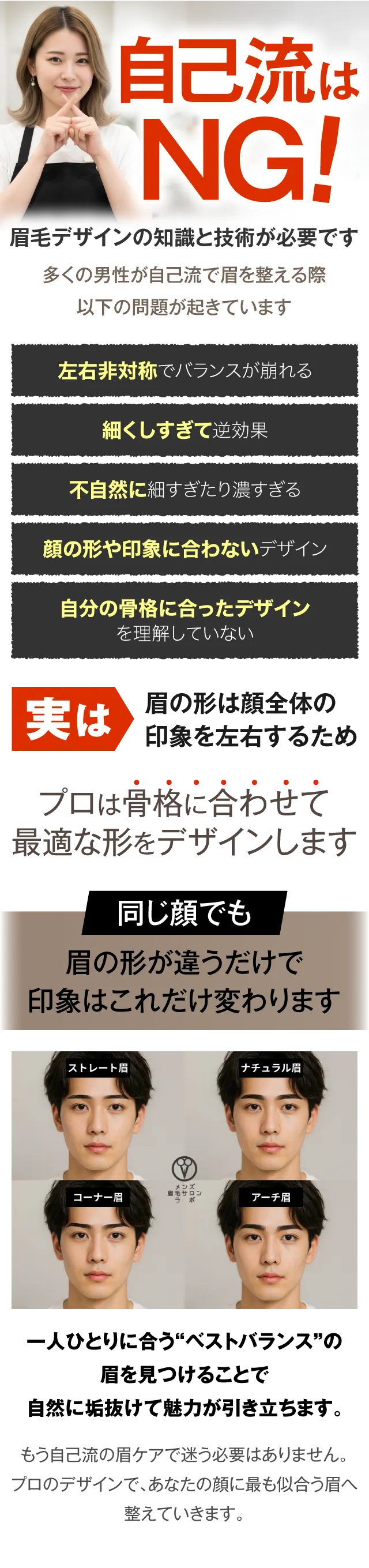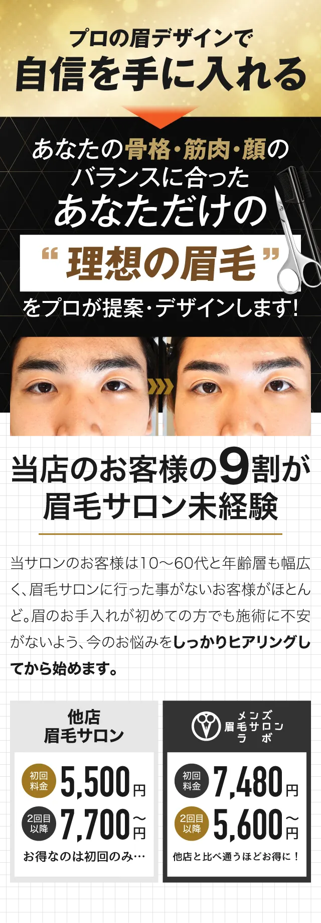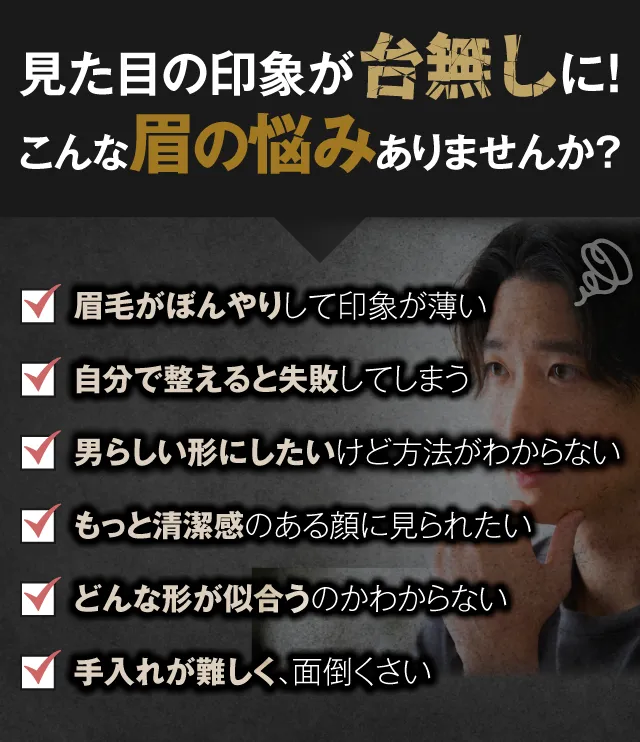メンズ眉毛サロンラボでは、眉毛のプロがあなたの眉毛に関する悩みを徹底的にヒアリングし、骨格・筋肉・顔のバランスに合った”眉毛をデザイン"。