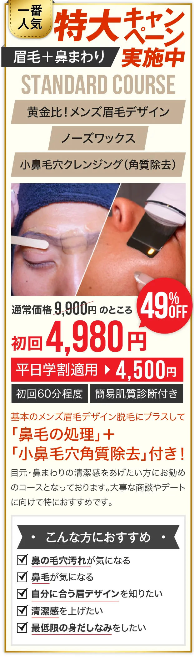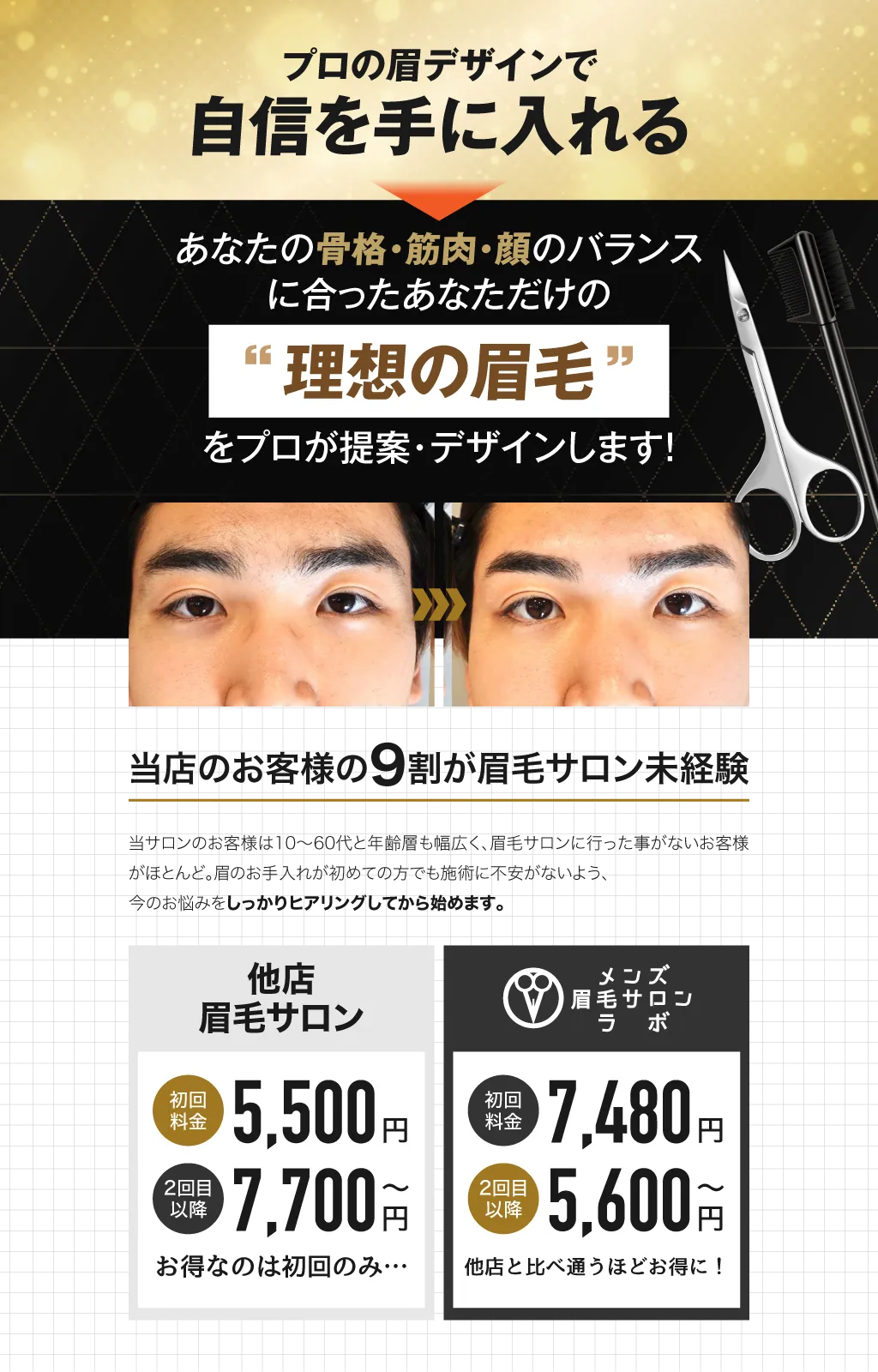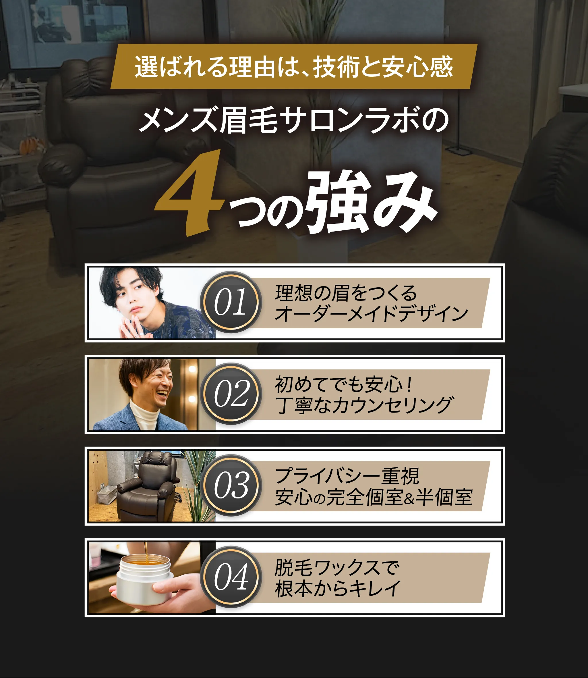 メンズ眉毛サロンラボでは、眉毛のプロがあなたの眉毛に関する悩みを徹底的にヒアリングし、骨格・筋肉・顔のバランスに合った”眉毛をデザイン"。